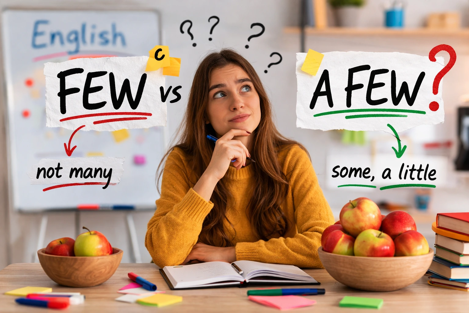 Ключ до теми “як відрізнити few від a few” лежить у семантиці, тобто в сенсі. В англійській few та a few описують кількість, але одночасно додають оцінку. У розмові ми не просто повідомляємо факт, ми передаємо ставлення. Саме тому різниця між few і a few важлива для природного звучання.